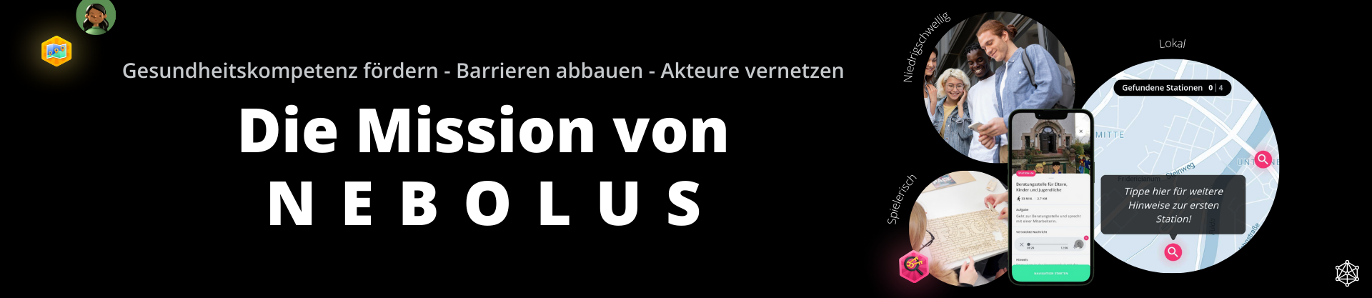 Das zentrale Anliegen von Nebolus ist die spielerische Förderung der navigationalen Gesundheitskompetenz. Navigationale Gesundheitskompetenz meint dabei die Orientierungsfähigkeit im Gesundheitsangebot des Sozialraums und dabei konkret das Finden, Verstehen, Bewerten und Anwenden von gesundheitsbezogenen Informationen im Sozialraum.
