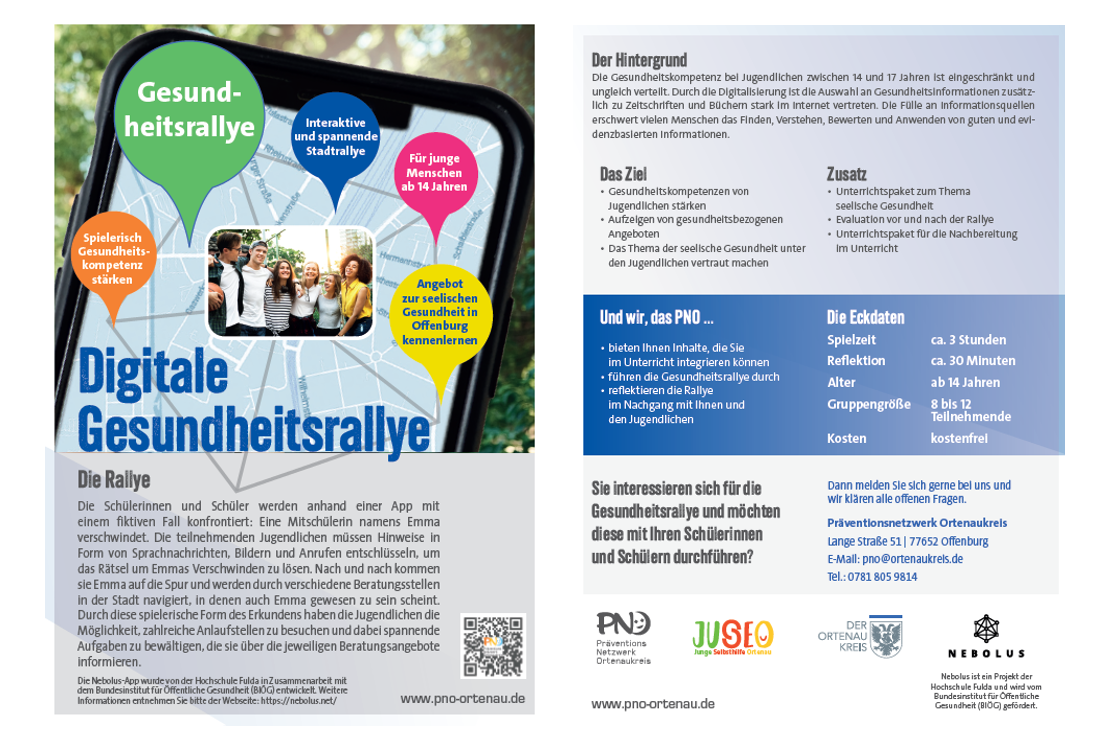 Im Rahmen der jährlichen Aktionswoche zur seelischen Gesundheit wurde erstmals eine Nebolus-Rallye in der Stadt Offenburg geplant. Unter der Leitung zwei engagierter Mitarbeiterinnen übernahmen das Präventionsnetzwerk Ortenaukreis und die Junge Selbsthilfe Ortenau des Landratsamtes die Verantwortung und Steuerung der Rallye für Schülerinnen und Schüler der Berufsfachschule.